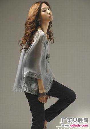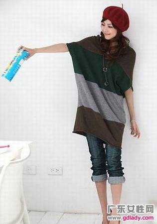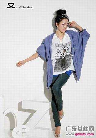 点评:蝙蝠袖的独特款式改变了上身的轮廓,与长项链或者是腰带等细节位的搭配都能轻松转移了聚集腰部的视线,紧身牛仔裤帮助拉长整体线条。