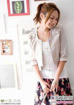点评:如果不喜欢七分袖的外套,那么在选择其他外套的时候,需要注意外套的长度一定要刚好到腰线的位置,与下身搭配的牛仔裤或者是裙装之间产生距离感,显现腰部的轻盈感。