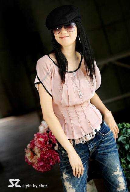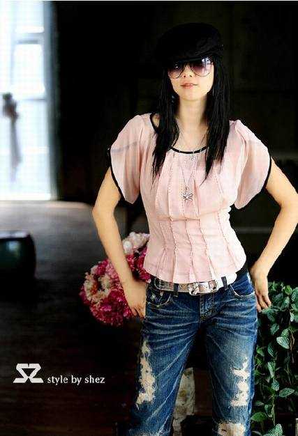 粉粉的淑女上衣搭配牛仔裤,再配上一副太阳镜,时尚清爽