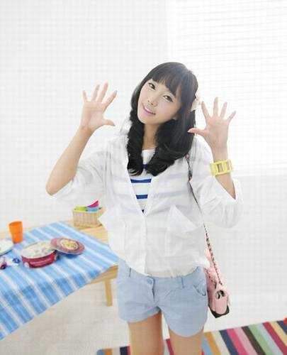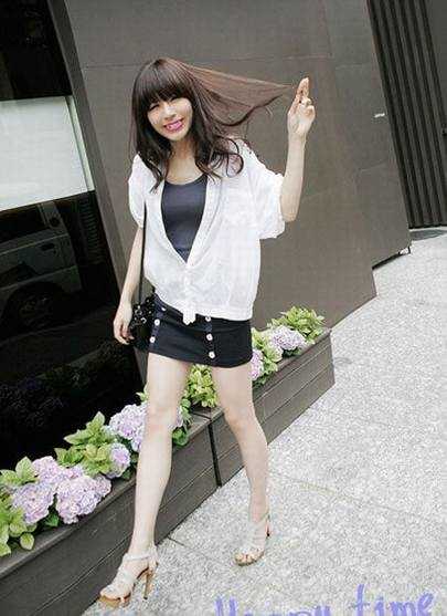 在紧身的和超短裙外面搭配一件宽松的白衬衫,收敛掉辣妹的艳俗,增加纯净自然的亲和力哦。. L; V9 w, w: O" V5 }3 J7 C