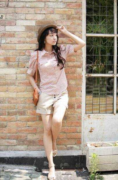 &w7 s* l, \. _( \3 q粉色格子衬衫搭配卡其色卷边工装裤,甜美质朴的乡村田园风。