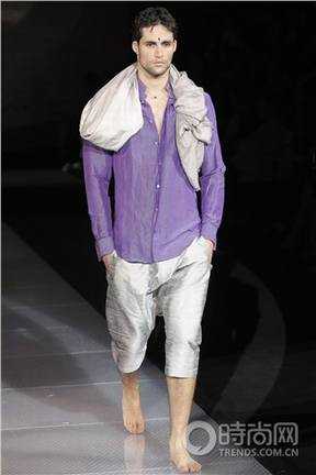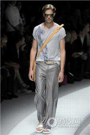 围巾也是今夏不可或缺的潮流搭配元素,Armani今年春夏对围巾的演绎相当精彩,绢绸质地的亮丝呈现贵族的气质,最特别的是系法,只是随意地皱皱的搭在颈肩,配合水洗皱褶的丝麻衬衣和时下最流行的低档收裤腿七分裤,淡泊、大气,品味不凡。