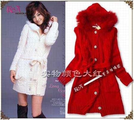 尚衣坊★特价 瑞丽韩版镶鸵鸟毛 连帽束腰中长毛衣外套 45.0元