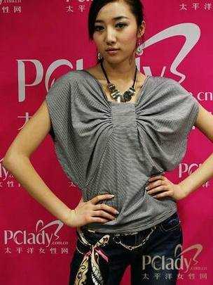 银灰色蝴蝶形T恤,搭配小喇叭牛仔裤拉伸腿部线条曲线,如果你喜欢DIY,也可以将丝巾系在腰间,别有一番风情。