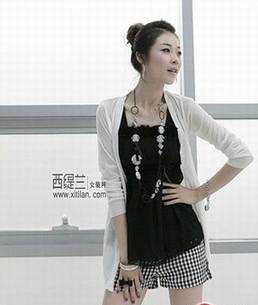 夏天衣服搭配点评四:黑色的外搭白色的小开衫,带上首饰,下身搭配黑白格子。小开衫让脸部看起来比较清瘦。露出的锁骨,增添女士气质