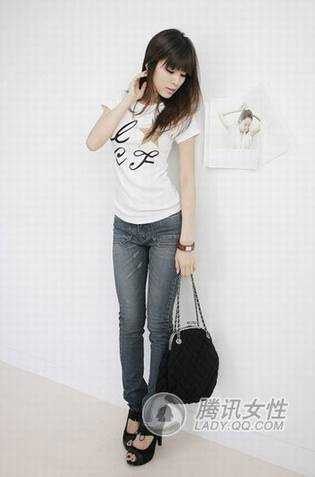 夏装图片 性感关键词:紧身简约 时尚夏天服饰搭配点评:紧身仔裤包出纤细美腿,小t恤简单时尚,不露一样展示出迷人身材,适合比较低调型的女生。 效仿实用度:100%