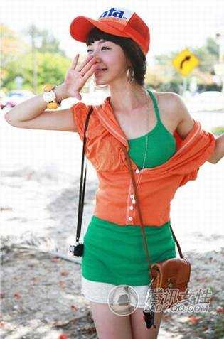 夏装图片 性感关键词:轻松明朗的露肤 时尚夏天服饰搭配点评:吊带衫配小热裤,外罩一件宽松卡腰版小外套,让你在轻松随意间微露小小的性感。 效仿实用度:80%
