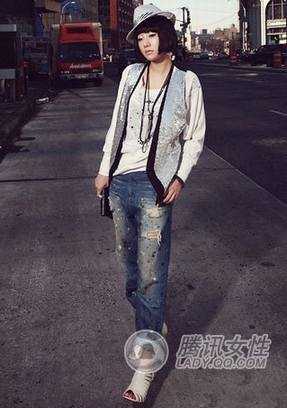 白色长袖套衫+银色亮片中长款马甲 +破洞磨旧