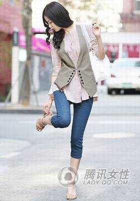 粉色高领雪纺 +灰色西装马甲+牛仔 7分