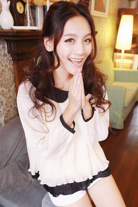 很淑女浪漫的雪纺衫,前身层叠缜密的荷叶边和袖口相呼应,荷叶袖口,不显手臂上的肉肉。可爱娃娃领,充满俏皮感,清新自然。