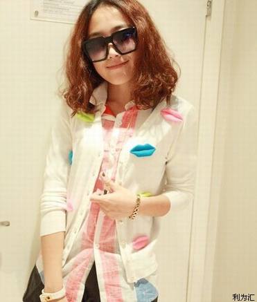 嘴唇开衫很有爱诶 白色还是有点小清新的感觉 衣服上点缀的各种色的笑嘴唇好可爱呀。