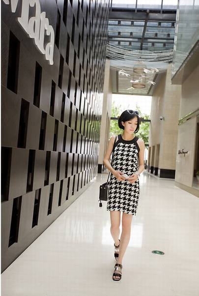 韩版 无袖 千鸟格 连衣裙