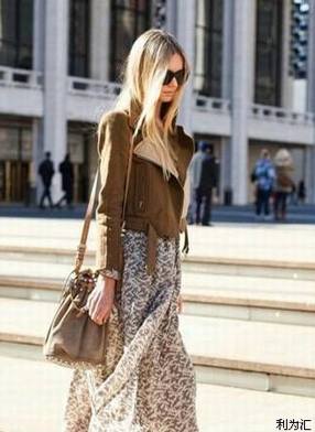 黑色皮衣帅气个性,混搭雪纺长裙的柔美仙气,出来效果非常美,尤其是这款拼色几何图形的长裙,一下就攫获众人眼球。