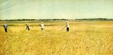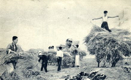 安徽省怀远县王咀村是淮河边上的一个村庄。过去这里几乎年年闹水灾。自从修治淮河后,这里连年获得了丰收。今年麦收时,家家场子上又铺满子金黄的小麦。