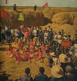 五河位于淮河下游,是浍河、沱河、和潼河的汇口处,河多湖多,地形低洼。从前的五河县是:“五河五道河,河多灾害多,有雨泛洪水,无雨禾着火,弃儿又卖女,乞讨度日月。”而现在的五河则是:五河五道河,河多幸福多,鸭鹅鱼满塘,稻麦闪金波,丰衣又足食,遍地幸福歌。”图为新集公社在庆丰收。(1960年)