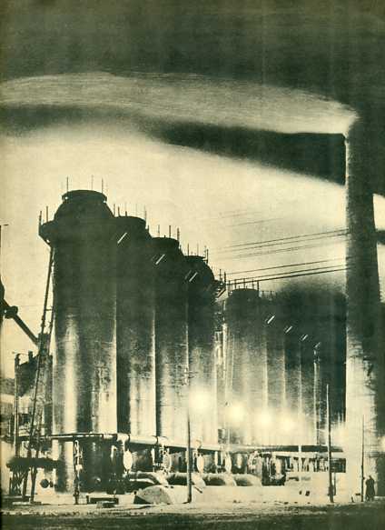 过去由于日本帝国主义和国民党反动政府严重破坏而停火8年的马鞍山铁厂6座炼铁炉,现已改建成功,全部出铁。图为一号炼铁炉的全景和二号炼铁炉的一部分。(1954年)