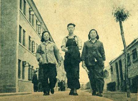 北京人民印刷厂的工人,从他们的宿舍走向工厂。