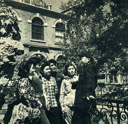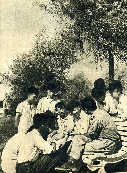 余暇时,同学们与创造小轧钢机成功的全国工业劳动模范张明山在公园里游玩。