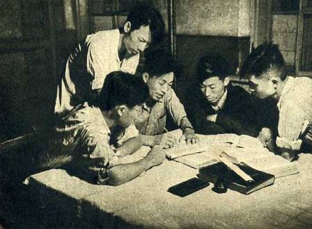 清华大学建筑系华侨学生,在系主任梁思成教授(中)家里,向他请教关于民族形式的建筑问题。