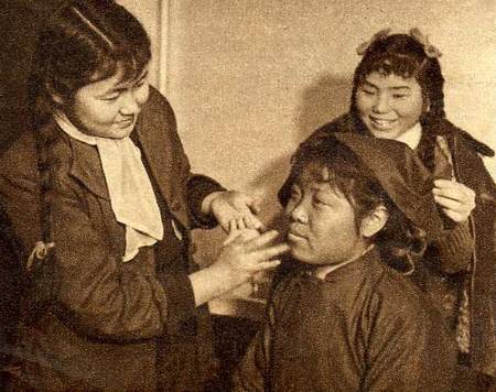让每次晚会都有新的节目和职工见面,夏宝森(中)在这次晚会以前创作了新的歌曲“生产任务要提前完”。