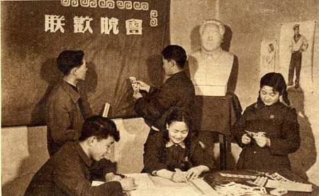 工人业余美术组在晚会前,设计海报,把好消息告诉全厂职工。