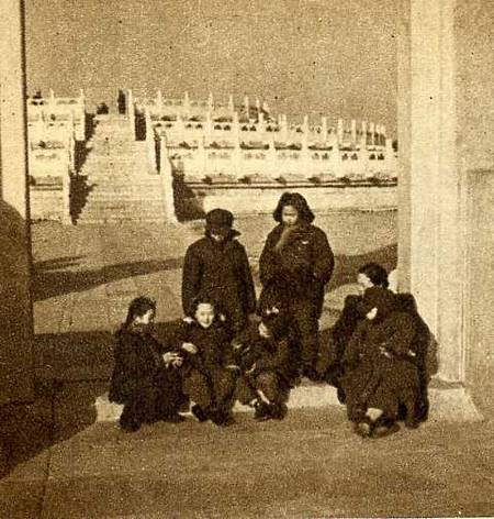 施仲琪的妻子,带着自己和邻居的孩子们在北京天坛游玩。