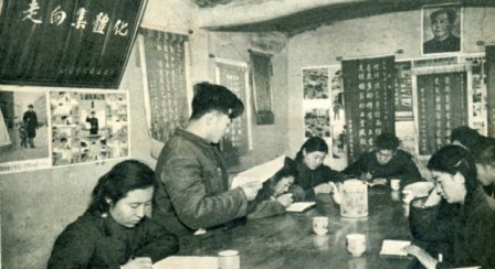 图为来广营社“生活简报”经常对社员进行批评和表扬,王文达(右起第二人)就是受到表扬的一个。