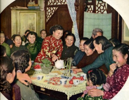 李老太太(右第一人)过去一直不看报,现在参加了居民委员会组织的读报组,时常和邻居们谈谈报上有趣的事情。
