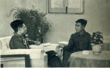 中央歌舞团汽车司机史登岐(右)来到北京市人民委员会的接待室,向政府工作人员提出节约燃料的建议,希望在辗路机上用泥炭代替普通煤。这个建议已经被采纳了。