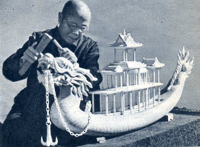 北京象牙雕刻厂的老艺人崔华轩正在精心雕刻一座象牙“跃进大龙舟”,这座龙舟长达5尺,上面将有100多个人物。