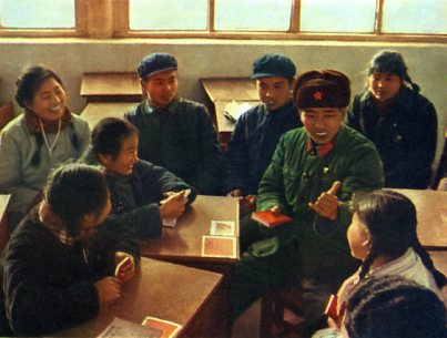 驻校解放军以自己的模范行动传三八作风,带四个第一。这是解放军通过谈心对同学进行深入细致的政治思想教育。