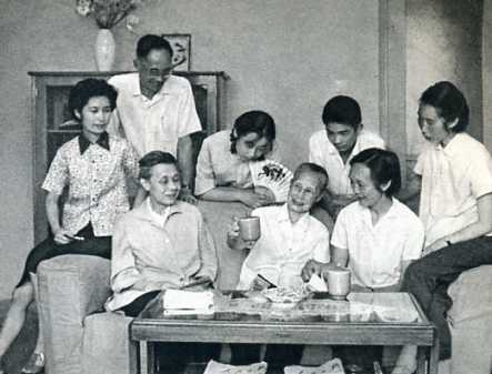 韩咏华女士在新居与妹妹韩权华(第四届全国人民代表大会代表)、儿子梅祖彥(清华大学水利系讲师)、女儿梅祖芬(大连铁道学院工作人员)以及儿媳、孙子、外孙女等等欢聚。