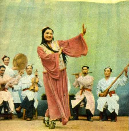学校里的文艺工作团演出的节目都是各民族自己的舞蹈、音乐和歌唱。这是彝族的安乐山舞。