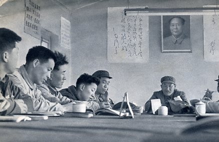 怀柔县抓革命促生产第一线指挥部以毛泽东思想指挥春耕生产。图为指挥部成员定期学习毛主席著作。