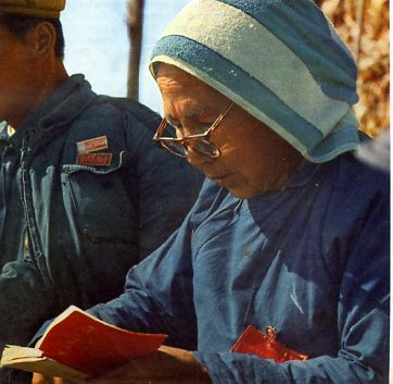 庙城公社焦村大队六十四岁的烈属张永秀老大娘在劳动休息时学习毛主席语录。这个队由于坚持活学活用毛主席著作,革命、生产都搞得很好。