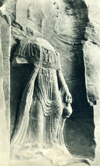 北山佛湾的提瓶观音,高80公分。头部和右臂已在解放前遭受破坏。