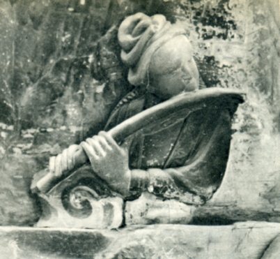 宝顶山大佛湾吹奏乐曲的双辫女郎。宋代石刻。高55公分。