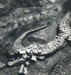 但是,这一类的庞然大物,特化得很厉害,只能适应于一定的自然条件。所以,当七千万年以前(白垩纪末期),地球上的自然条件发生剧烈变化,它们就全部绝灭了。图为合川马门溪龙在野外埋藏情况。(1965年)