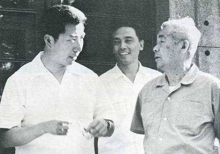 张文裕与到访的美籍物理学家丁肇中(左)交谈。(1978年)