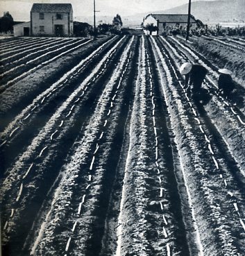 福建省福清县的音西大队摸索出一套合理轮种套作的科学方法,提高了土地使用率,这是在大豆田里套种甘蔗。
