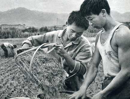 东游公社良种场科研小组的知识青年在田间进行杂交水稻考种。