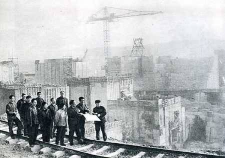 陈宗基和科技人员在现场研究由于爆破而引起的岩层错动现象。