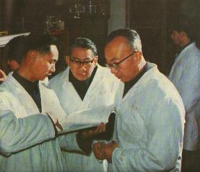 王应睐教授(中)和上海生物化学研究所研究员王德宝(前右一),与科技人员一起讨论实验结果。