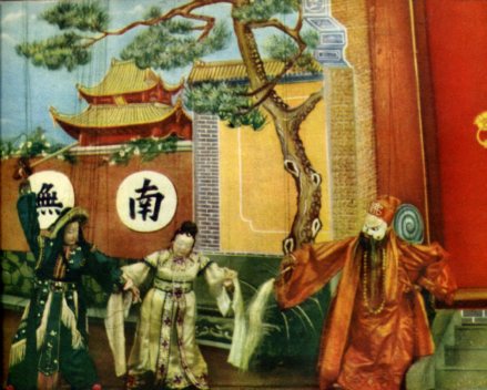 木偶的形象、服装的设计雕刻,都是由专门的艺术人担任的。这位艺人正在描绘一个新戏里的木偶。