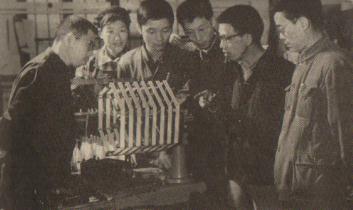 机修车间计量小组在“质量月”活动中被评为先进集体,受到省经委的表扬奖励。图为他们在研究纺纱测长机心脏部件的修整问题。