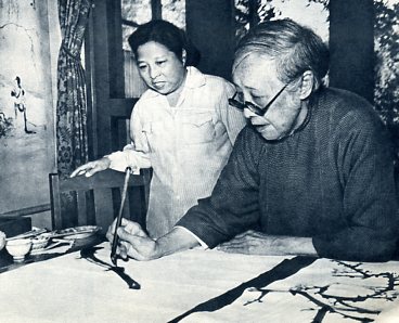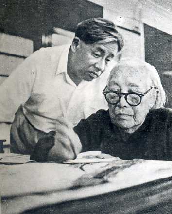 何香凝老人在家中作画。陪同的是她的女儿梦醒。
