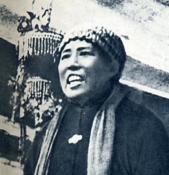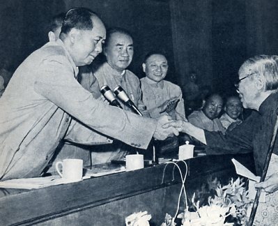 1961年在庆祝中国共产党成立四十周年纪念大会上,何香凝代表各民主党派,无党派民主人士和中华全国工商业联合会献词。这是在她讲话后毛主席与她握手。