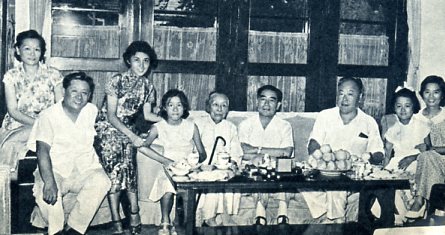 何香凝老人在家中与前来祝贺她的生日的周恩来总理、陈毅副总理和夫张茜(右一)合影。左起第二人是廖承志,第一人是廖承志夫人经普椿。