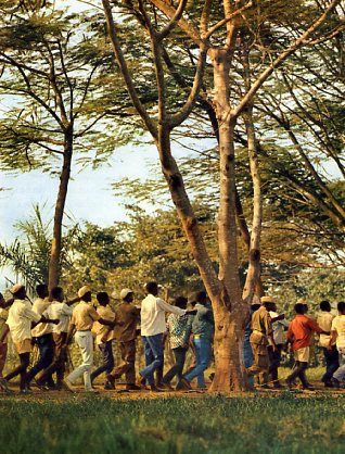 青年们高唱革命歌曲:“起来,刚果青年,……让我们为国家工作,让我们团结起来,卷起袖子来,为未来而工作……”