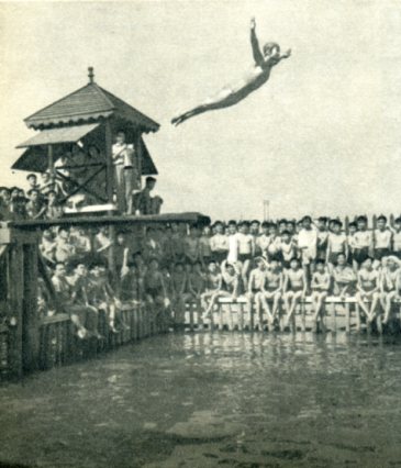 说明:这里是广州珠江游泳场,在珠江边上,用木桩围起来。现在已不可能这样做了。这是编者少年时最爱去的地方之一。